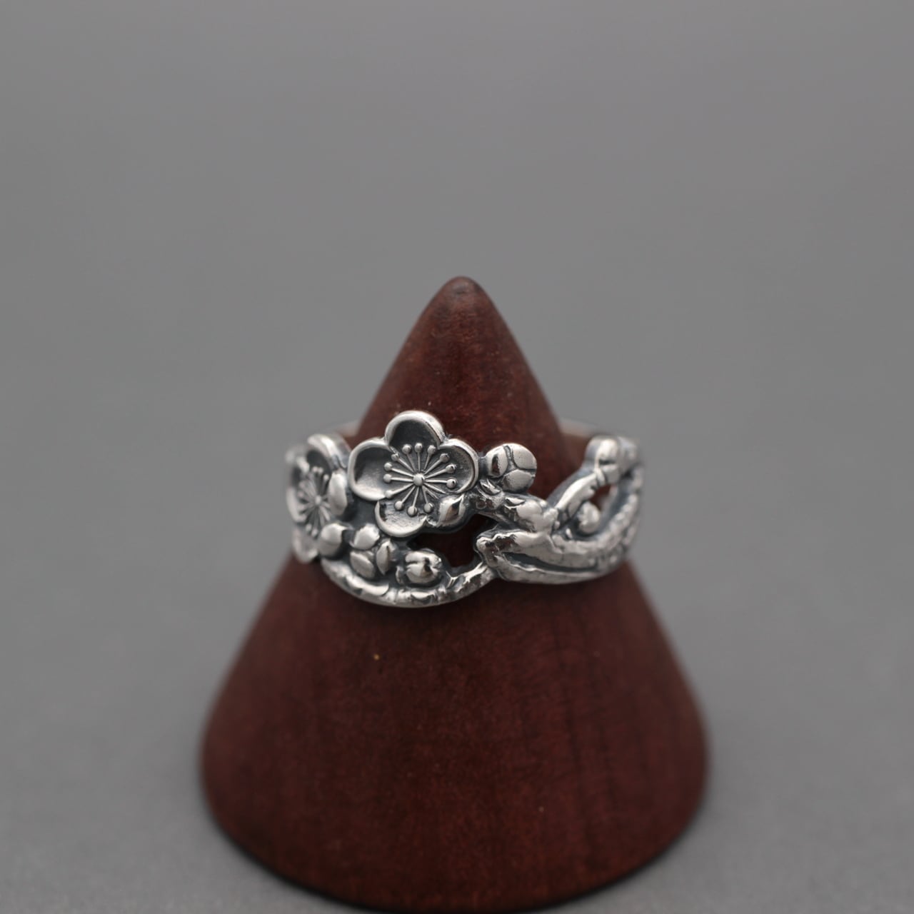梅の花が咲く、透かし彫りで幹の表情も見事な、和風な銀製の指輪