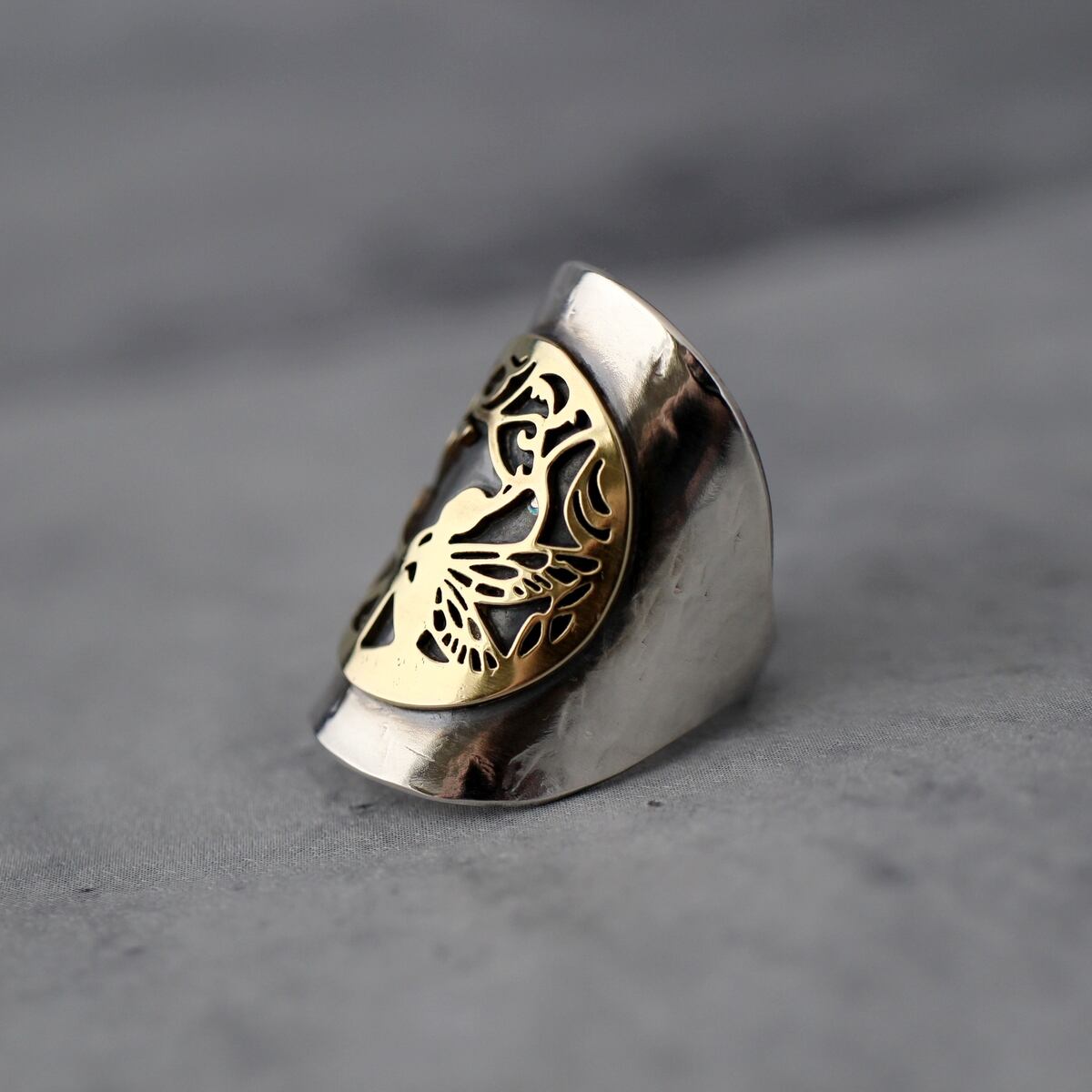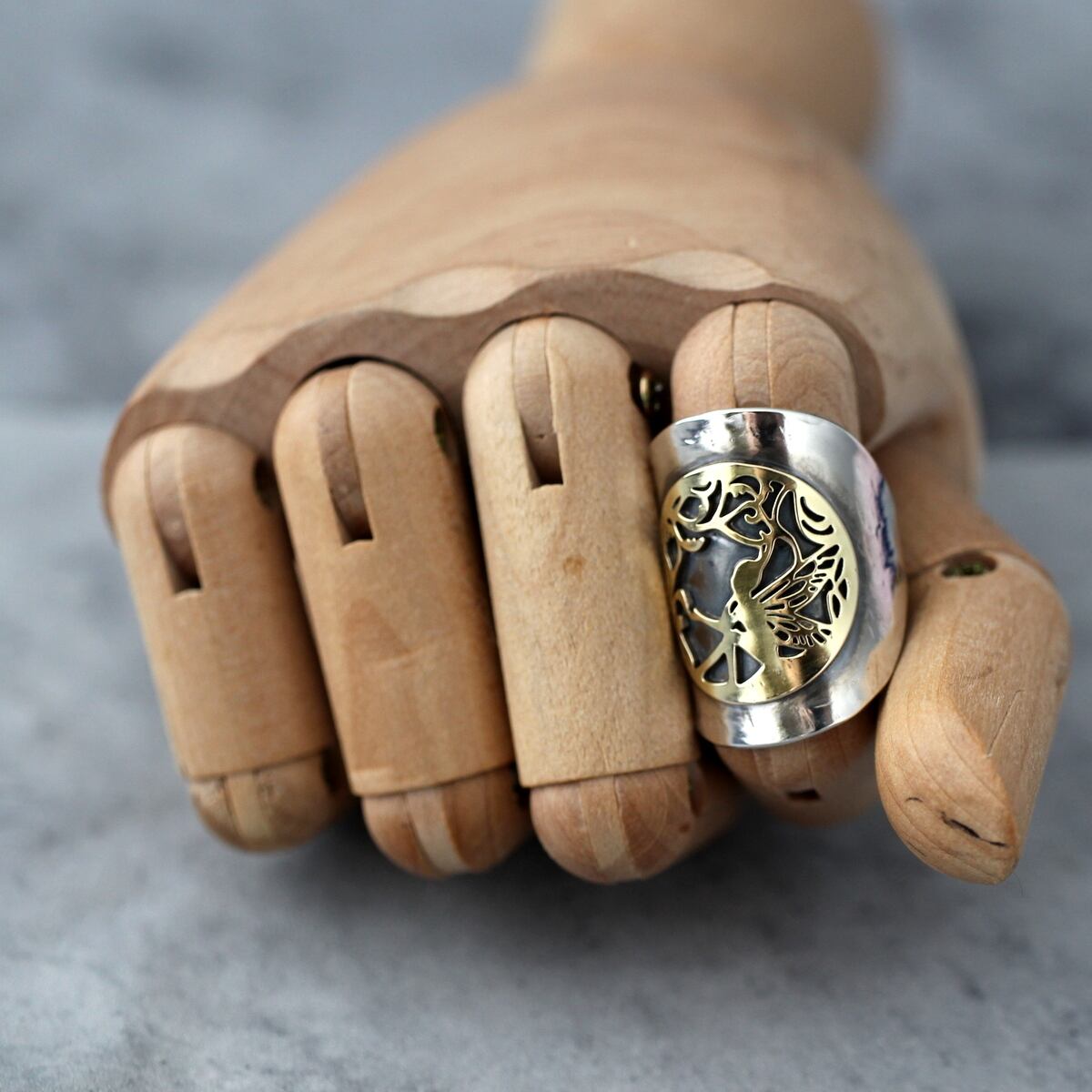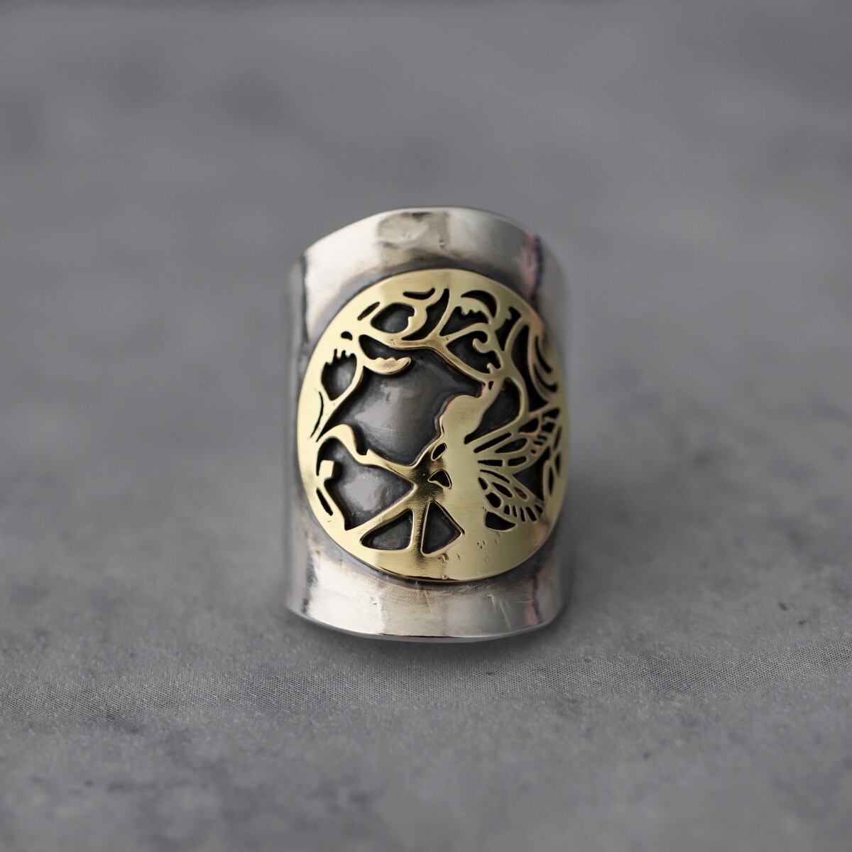 静寂の森の妖精のデザインシルエットの真鍮と、槌目入りのシルバーとのコンビです。