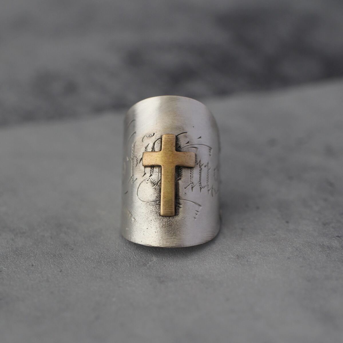 フローラルな装飾にハンドカービングが印象的なベースに真鍮のクロスを合わせました。
