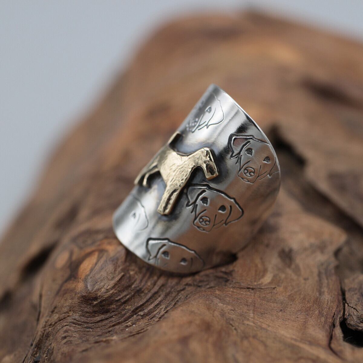 ダックスフンドっぽい真鍮の犬と、まっすぐにこちらを見る犬を刻印したリングです。