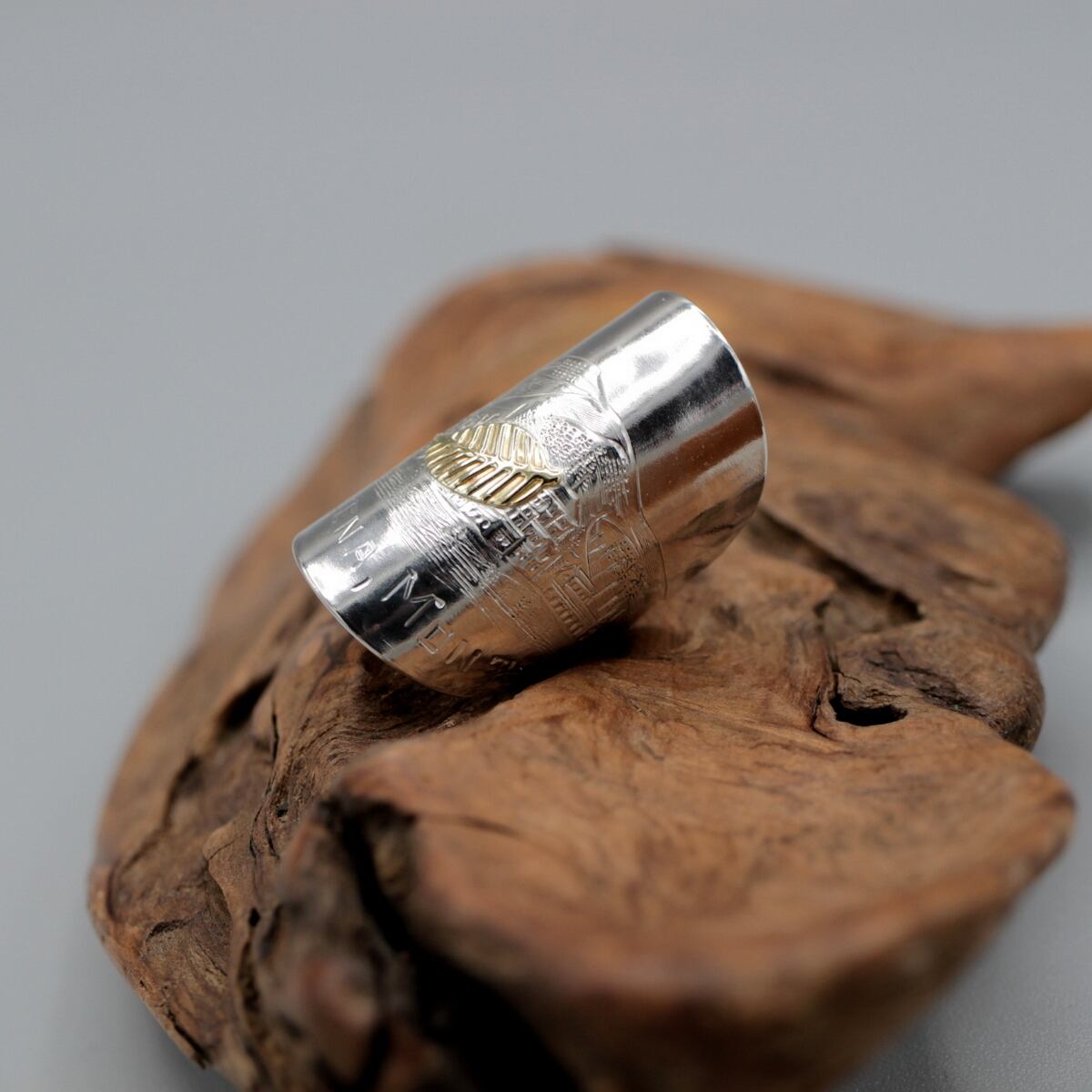 山と川との間にある町の風景を手彫りしたものに、真鍮の葉っぱを合わせました。